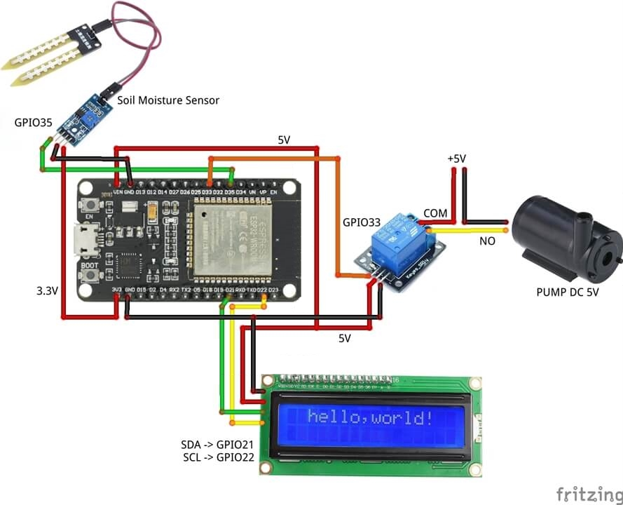 Controle automático da bomba de água com MicroPython. Usando a placa ESP32 e o sensor de umidade do solo. Ligue a bomba de água se o nível de umidade do solo for baixo. Desligue a bomba de água se o nível de umidade do solo for alto. Mostrar o status na tela LCD.