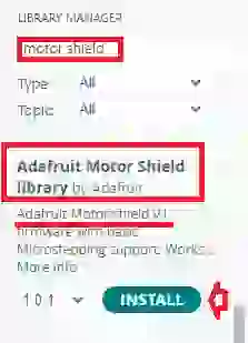 Filtre sua pesquisa digitando “motor shield“. Procure por Adafruit Motor Shield library (V1 Firmware) by Adafruit. Clique nessa entrada e, em seguida, selecione Install (Instalar).