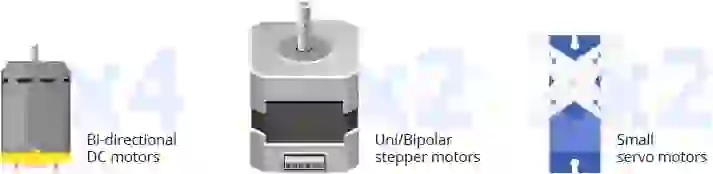 Os canais de saída de ambos os CIs L293D são divididos até a borda da blindagem com dois terminais de parafuso de 5 pinos rotulados como M1, M2, M3 e M4. Um total de quatro motores CC operando entre 4,5 e 25 V pode ser conectado a esses terminais.