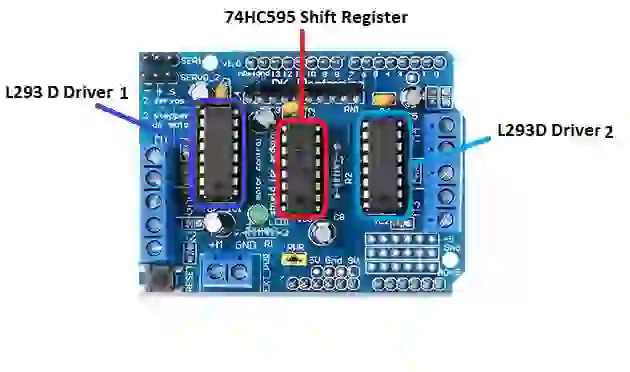 O cérebro do shield são dois drivers de motor L293D e um registrador de deslocamento 74HC595.