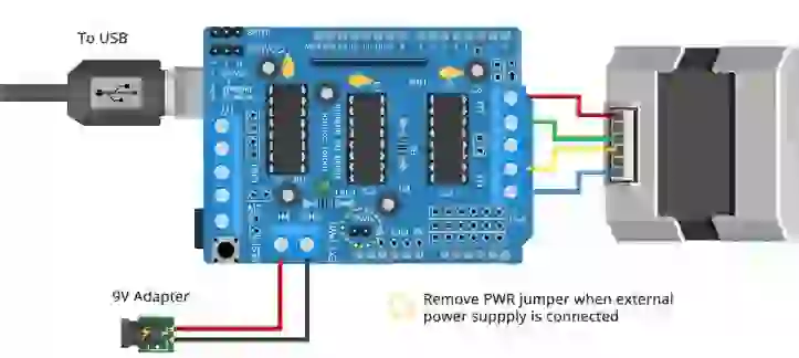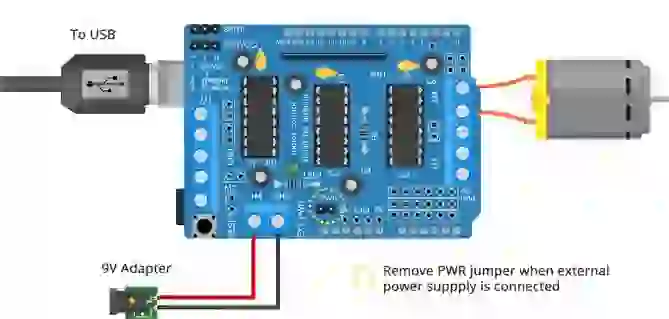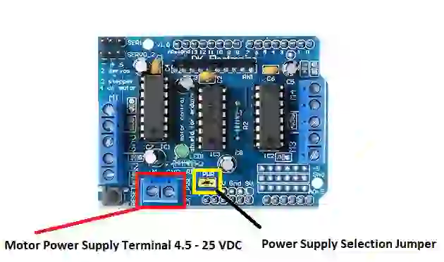 O shield suporta uma faixa de tensão do motor de 4,5 a 25 volts. Essa energia pode ser compartilhada com o Arduino ou usada separadamente. Para escolher entre os dois, um jumper especial denominado PWR é fornecido próximo ao conector de alimentação de dois terminais.