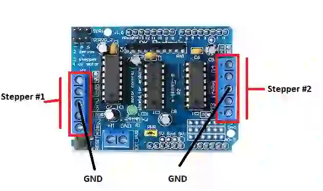 Você também pode conectar dois motores de passo aos terminais de saída. Um motor de passo (Stepper) é conectado a M1-M2 e o outro a M3-M4.
