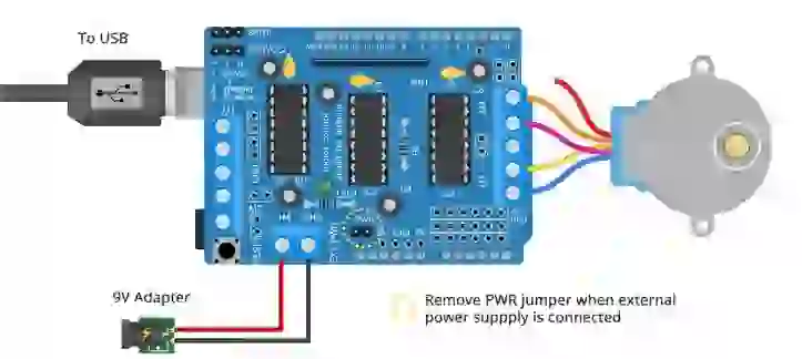 Os motores de passo unipolares 28BYJ-48 são classificados em 5 V e fornecem 48 passos por rotação. Portanto, conecte uma fonte de alimentação externa de 5V ao terminal EXT_PWR.
