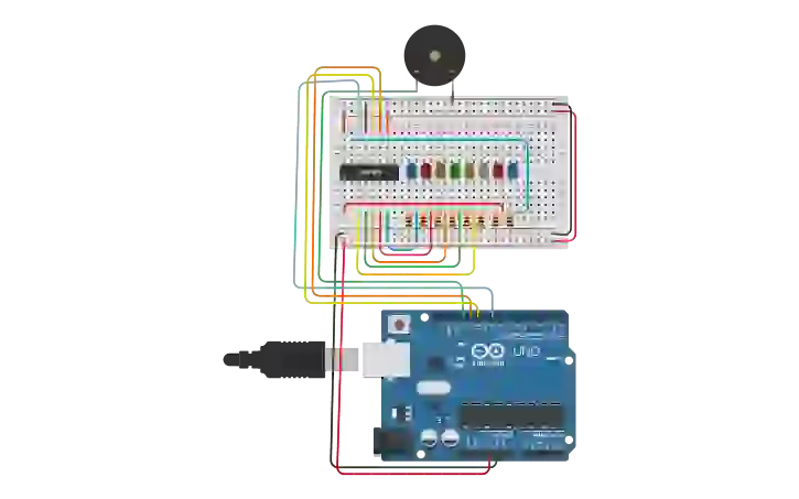 Monte o circuito utilizando a protoboard, o registrador de deslocamento, os LEDs, os resistores e os fios.