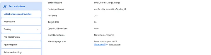 Se o seu app já está publicado na Play Store (claro que está — caso contrário, por que você estaria se estressando com isso? 😉), verificar é super fácil. Basta ir ao Play Console, abrir o seu lançamento mais recente e, na seção do Bundle, clicar na setinha ao lado do pacote do seu app. Role para baixo até os Detalhes do app e você verá um campo chamado Tamanho da página de memória. É ali que o Google diz educadamente se o seu app é um cidadão amigável aos 16KB ou se ainda está preso na Idade da Pedra dos 4KB.”