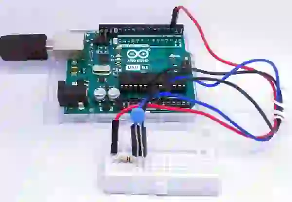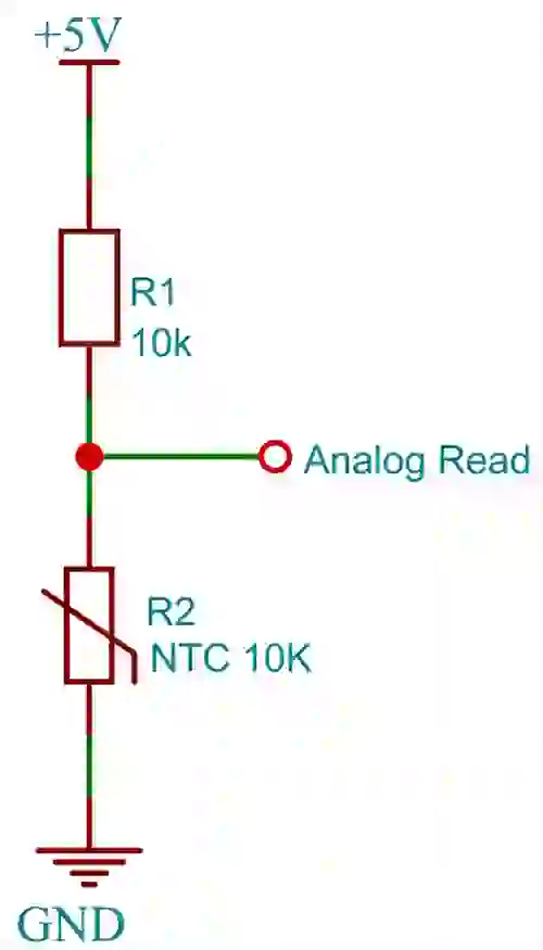 Para medir a resistência de um termistor NTC, usaremos um divisor de tensão. Um terminal do termistor será conectado à linha VCC por meio de um resistor de valor conhecido e o outro terminal será conectado ao terra. As conexões serão como mostrado abaixo.