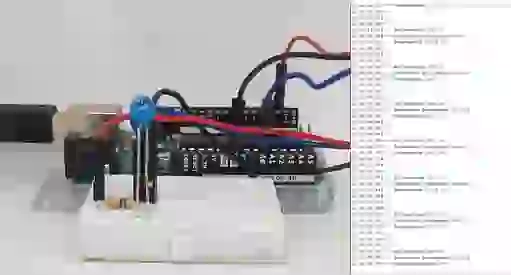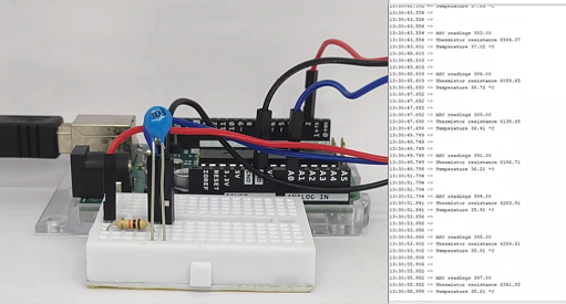 Na função de loop, a tensão no divisor de tensão é medida usando o pino analógico A0. Cinco amostras são coletadas e a média é calculada para melhor precisão. Esse valor é usado para calcular a resistência do NTC. Usando a resistência, a resistência nominal e o coeficiente beta, a temperatura é calculada usando a equação de Steinhart-Hart. Em seguida, a resistência e a temperatura são impressas no monitor serial.