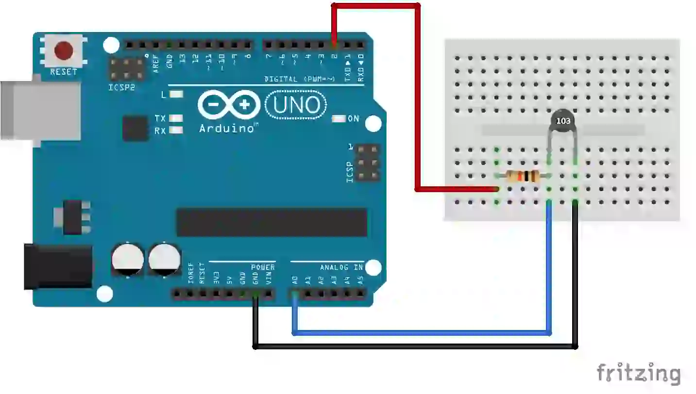 Você deve estar se perguntando por que conectamos o resistor de referência ao GPIO2 em vez do pino de 5V. Isso se deve ao fenômeno do autoaquecimento. Se conectarmos um termistor de 10K com um resistor de 10K para formar um divisor de tensão, e o divisor de tensão for conectado a 5V e depois ao terra, teremos um fluxo de corrente mínimo de cerca de 25mA (5V / (10K + 10K) = 0,25mA) o tempo todo. Mesmo que isso não pareça uma grande quantidade de corrente, com certeza aquecerá seu termistor, pois mesmo o fluxo de corrente de 25 mA pode causar uma dissipação de energia de cerca de 0,625 mW (0,25 mA x 2,5 V). Isso também se considerarmos que o valor do termistor e o resistor de referência permanecem constantes. Como sabemos, a resistência do termistor varia drasticamente com a temperatura. Portanto, permitir o fluxo contínuo de corrente afetará a leitura. Portanto, para evitar isso, só colocaremos o GPIO em nível alto enquanto estivermos fazendo a leitura e, assim que fizermos a leitura, mudaremos o estado do GIO para baixo. A conexão real é mostrada na imagem abaixo.
