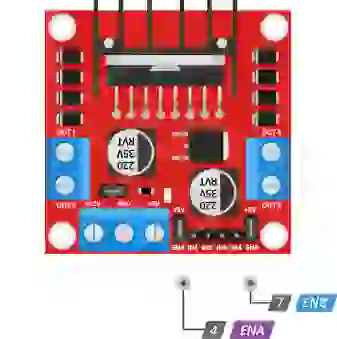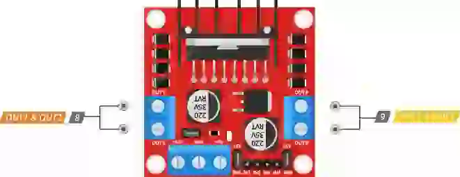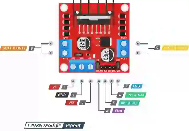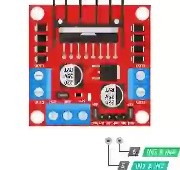 O módulo possui dois pinos de controle de direção. O IN1 e IN2 os pinos controlam a direção de rotação do motor A; Enquanto IN3 e IN4 controle a direção de rotação do motor B.