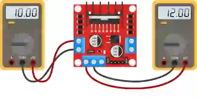 O L298 N tem uma queda de tensão de aproximadamente 2V. Isso se deve ao fato de que os transistores de comutação internos têm uma queda de tensão de aproximadamente 1 V quando polarizados para frente, e como uma ponte H requer que a corrente passe através de dois transistores, a queda total de tensão é de 2 V.
