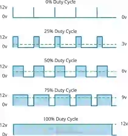 Quanto maior o ciclo de trabalho, maior a tensão média aplicada ao motor CC, resultando em um aumento na velocidade do motor. Quanto menor o ciclo de trabalho, menor a tensão média aplicada ao motor CC, resultando em uma diminuição na velocidade do motor.