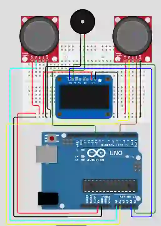 Esse jogo de pong com Arduino é jogado por dois jogadores e ambos controlam a direção da raquete com os joysticks fornecidos no Arduino Uno. O placar de pontuação é mostrado no meio e uma campainha também está conectada ao Arduino para emitir os sons de pontuação, vitória e derrota.