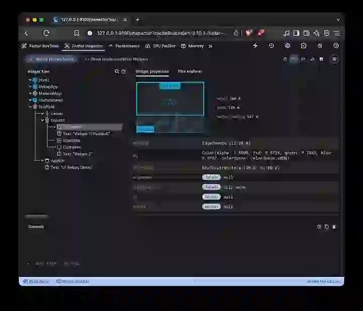 Abra o DevTools → Inspector → “Select Widget Mode”. Toque em qualquer widget e veja: