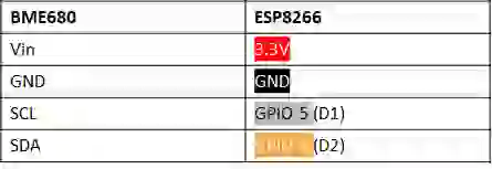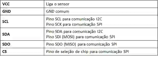 Esse sensor se comunica usando o protocolo de comunicação I2C, portanto, a ligação é muito simples. Você pode usar os pinos I2C padrão do ESP32 ou ESP8266, conforme mostrado na tabela a seguir: