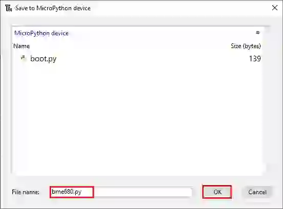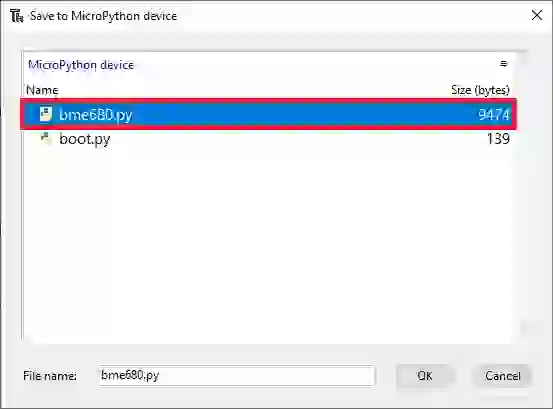 4. Nomeie seu arquivo como bme680.py e pressione o botão OK: