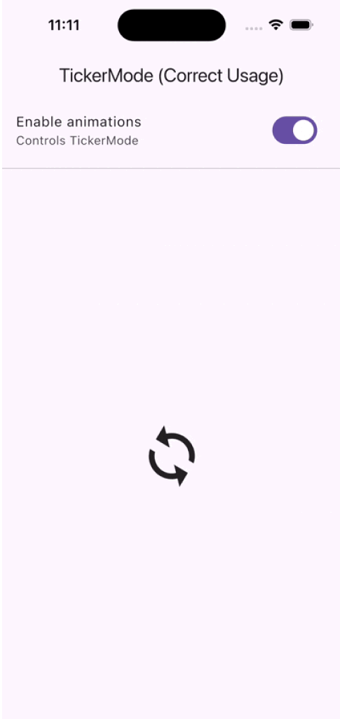 Nota: Quando usei o TickerMode pela primeira vez, envolvi meu widget animado e alternei a flag enabled — mas a animação não parou. Depois de algum tempo depurando, aprendi o “pulo do gato”: o TickerMode só afeta animation controllers criados dentro de sua própria árvore de widgets. No exemplo, o controller do RotationTransition vive dentro do widget que está abaixo do TickerMode, então alternar a flag pausa e retoma a animação corretamente. Se o controller estivesse fora, ele continuaria rodando — provando que o posicionamento na árvore de widgets é crucial para o controle adequado.
